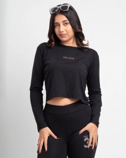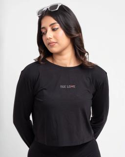 Embrace effortless cool with the Black "Tee Love" Cropped Long-Sleeve Top. Crafted from ultra-soft fabric for all-day comfort, this versatile piece features a flattering cropped silhouette and stylish long sleeves.
