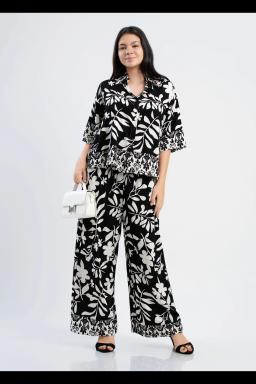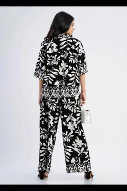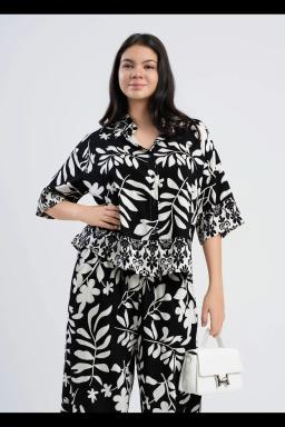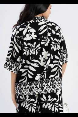 Stylish black and white floral collared blouse. Perfect for work or a night out. Features a flattering fit and classic design.