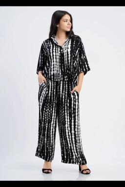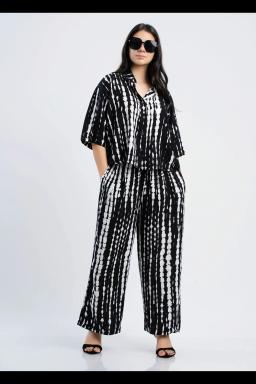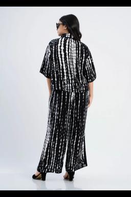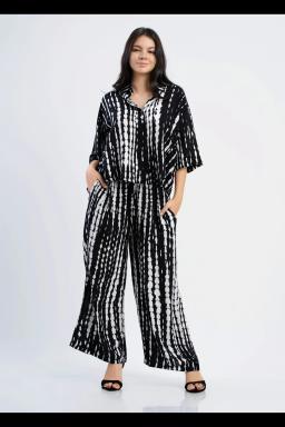 Effortlessly cool, these wide-leg pants feature a striking black and white tie-dye print. Perfect for a relaxed yet stylish look. Comfortable and flattering, they're ideal for everyday wear or a night out.