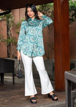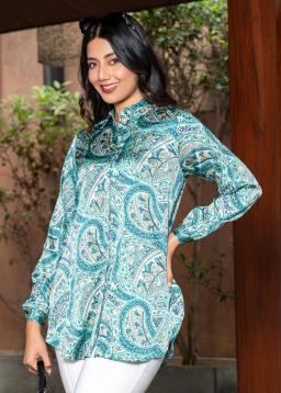 Embrace effortless style with the Boho Teal Paisley Button-Down Top. This eye-catching piece features a vibrant teal hue and a captivating paisley print for a bohemian flair.