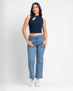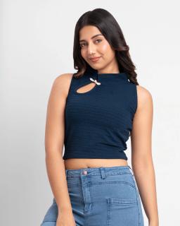 Chic and sophisticated, this navy blue sleeveless crop top is a wardrobe essential. The high neckline offers a touch of modern elegance, perfect for dressing up or down. Crafted from a flattering fabric, it drapes beautifully and provides comfortable all-day wear. Its versatile design pairs effortlessly with high-waisted skirts, trousers, or denim for a polished look that exudes confidence.