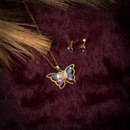 Adorn yourself with delicate enchantment. This stunning gold-plated butterfly pendant and stud earrings set captures the beauty of nature. Crafted with meticulous detail, each piece shimmers, adding a touch of effortless elegance to any outfit. Lightweight and comfortable for all-day wear, this set is the perfect gift for yourself or a loved one, offering timeless style and a whisper of whimsy. Elevate your look with this exquisite pairing.