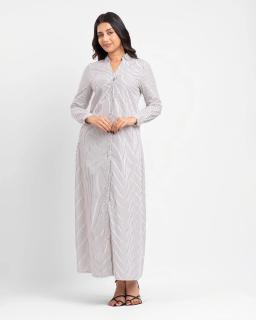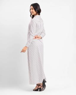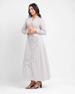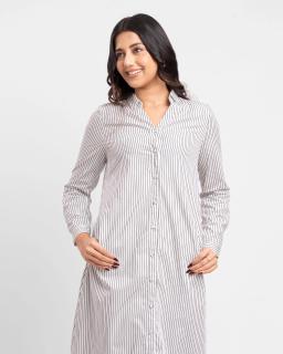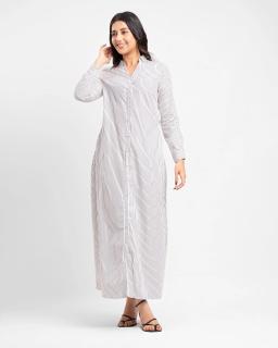 Effortless chic meets everyday comfort with our Ladies Long Sleeve Maxi Stripe Shirt Dress in classic Black/White. This versatile dress is crafted from a soft, breathable fabric that drapes beautifully for a flattering silhouette.