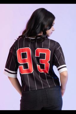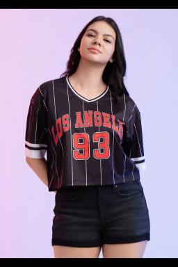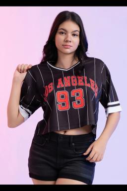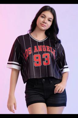 Stylish and comfy, this drop-shoulder crop tee features a playful letter graphic and striped trim. Perfect for a casual yet chic look.