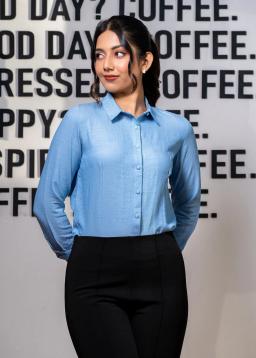 Effortlessly chic and undeniably professional, this light blue collared button-down blouse is your new office essential. Crafted from a breathable, soft fabric, it offers all-day comfort without sacrificing style.