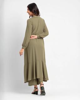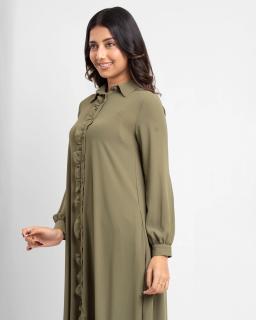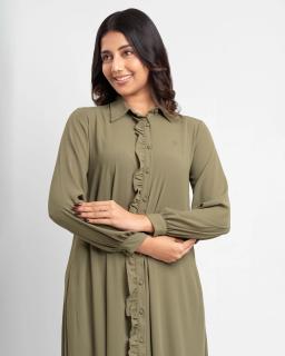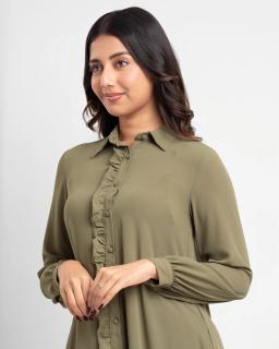 Embrace effortless elegance with this Olive Green Ruffled Long Tunic. Crafted for comfort and style, its flowing silhouette drapes beautifully, while delicate ruffles add a touch of feminine charm.
