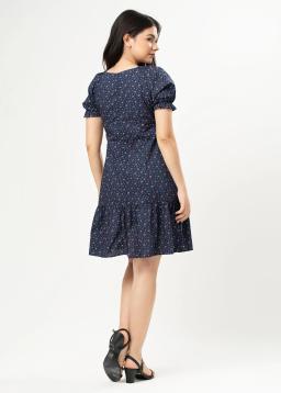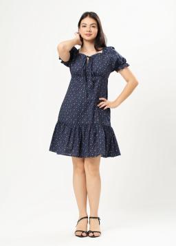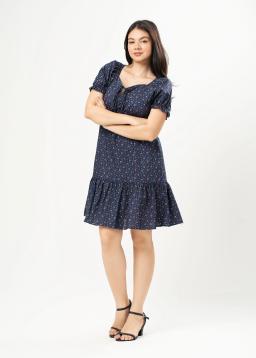 Dreamy navy blue babydoll mini dress designed to flatter. Featuring charming puff sleeves for a touch of romance and a playful ruffle hem that adds delightful movement. A delicate floral print blooms across the fabric, bringing a fresh and feminine vibe.