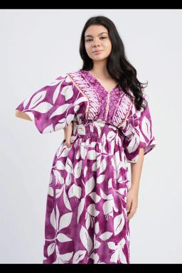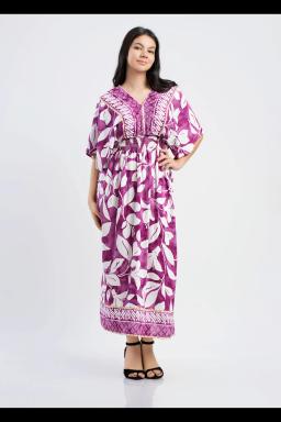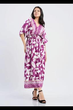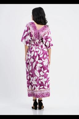 Flowy purple leaf print maxi dress. Bohemian style, perfect for summer. Lightweight and comfortable. Features a flattering silhouette.