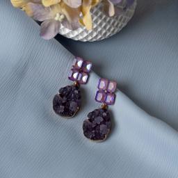 Adorn yourself with the captivating beauty of Raw Amethyst Druzy Drop Earrings. Each pair showcases unique, natural amethyst crystals, their sparkling druzy surfaces catching the light with every movement. These earrings offer a touch of bohemian elegance and are believed to promote calmness and intuition, making them more than just a stunning accessory. Their organic, unpolished charm adds an artisanal touch to any outfit, from casual daytime chic to sophisticated evening wear. Embrace the natural wonder and inherent tranquility these exquisite earrings bring.