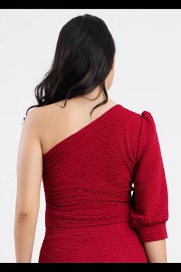 Make a statement in this red one-shoulder textured bodycon midi skirt. The unique texture adds visual interest to the figure-flattering silhouette. Perfect for a night out or a special occasion.