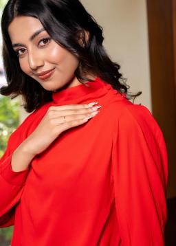 Elevate your everyday office style with this vibrant red pullover blouse. Featuring a chic gathered neckline that adds sophisticated detail and a touch of feminine flair, this top offers both comfort and elegance.