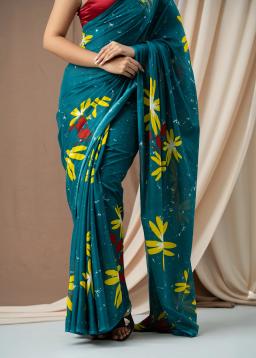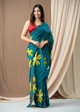 Drape yourself in the vibrant elegance of this teal green printed saree. Crafted from a flowing fabric, this exquisite piece features a captivating print that adds a touch of bohemian charm and sophisticated flair.