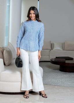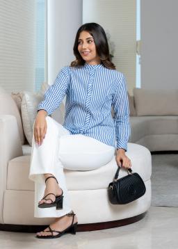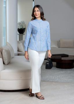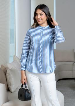 Elevate your everyday style with The Winslow Band-Collar Striped Blouse. Crafted from breathable fabric, this chic blouse features a timeless stripe pattern and a modern band collar for a polished yet relaxed look.