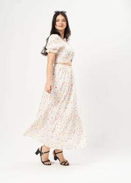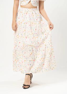 Effortless charm meets bohemian flair in this White Ditsy Floral Print Tiered Maxi Skirt. The delicate floral pattern on a crisp white background evokes a sense of timeless elegance, perfect for sunny days and warm evenings.