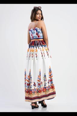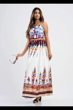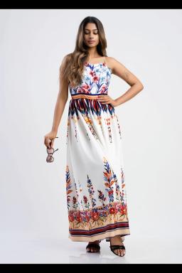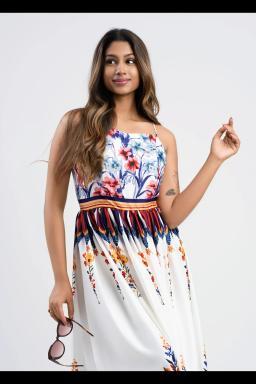 Flowy white maxi dress adorned with a delicate floral print. Features a flattering halter neckline and a comfortable, relaxed fit, perfect for summer occasions.