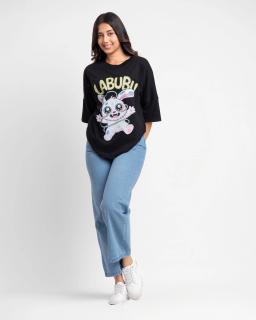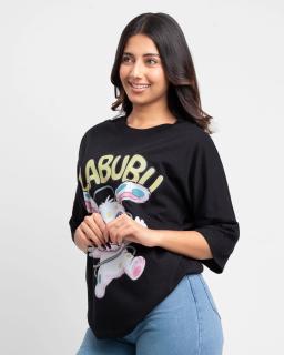 Embrace effortless cool with the Women's Black Labubu Oversize Tshirt. This ultra-comfy tee offers a relaxed, slouchy fit perfect for everyday wear. Crafted from super-soft fabric, it drapes beautifully for maximum comfort and style. Featuring a subtle yet iconic Labubu graphic, it adds a touch of playful personality to any outfit. Layer it up or wear it solo – this versatile oversized t-shirt is your new go-to for casual chic.