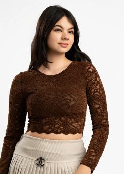 Embrace effortless charm with our Women's Brown Floral Lace Long Sleeve Crop Top. Crafted from delicate floral lace, this top offers a touch of romantic sophistication. The flattering long sleeves and trendy crop silhouette make it perfect for layering or wearing on its own. Dress it up with high-waisted pants or down with your favorite denim. Feel beautiful and confident in this versatile and chic piece.