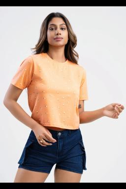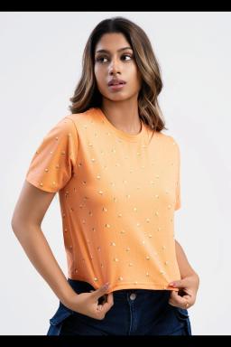 Make a statement in this vibrant orange embellished t-shirt. Delicate details add a touch of elegance to a casual classic. Perfect for everyday wear or a night out.