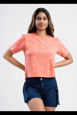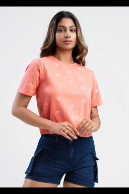 Embrace spring in this charming women's peach ditsy floral t-shirt. Soft, comfortable fabric features a delicate floral print for a feminine and effortlessly stylish look. Perfect for everyday wear.