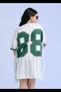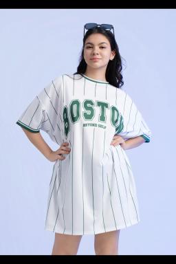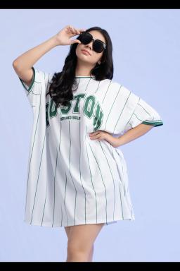 Stylish and comfy, this plus-size baseball tee dress features a trendy Boston print pinstripe design. Perfect for casual days, it offers a flattering fit and effortless style.