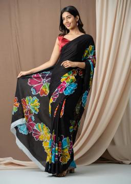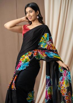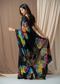 Drape yourself in ethereal elegance with our Black Floral Organza Digital Print Saree. Crafted from luxurious organza, this saree features a mesmerizing digital print bursting with vibrant floral motifs against a sophisticated black canvas.